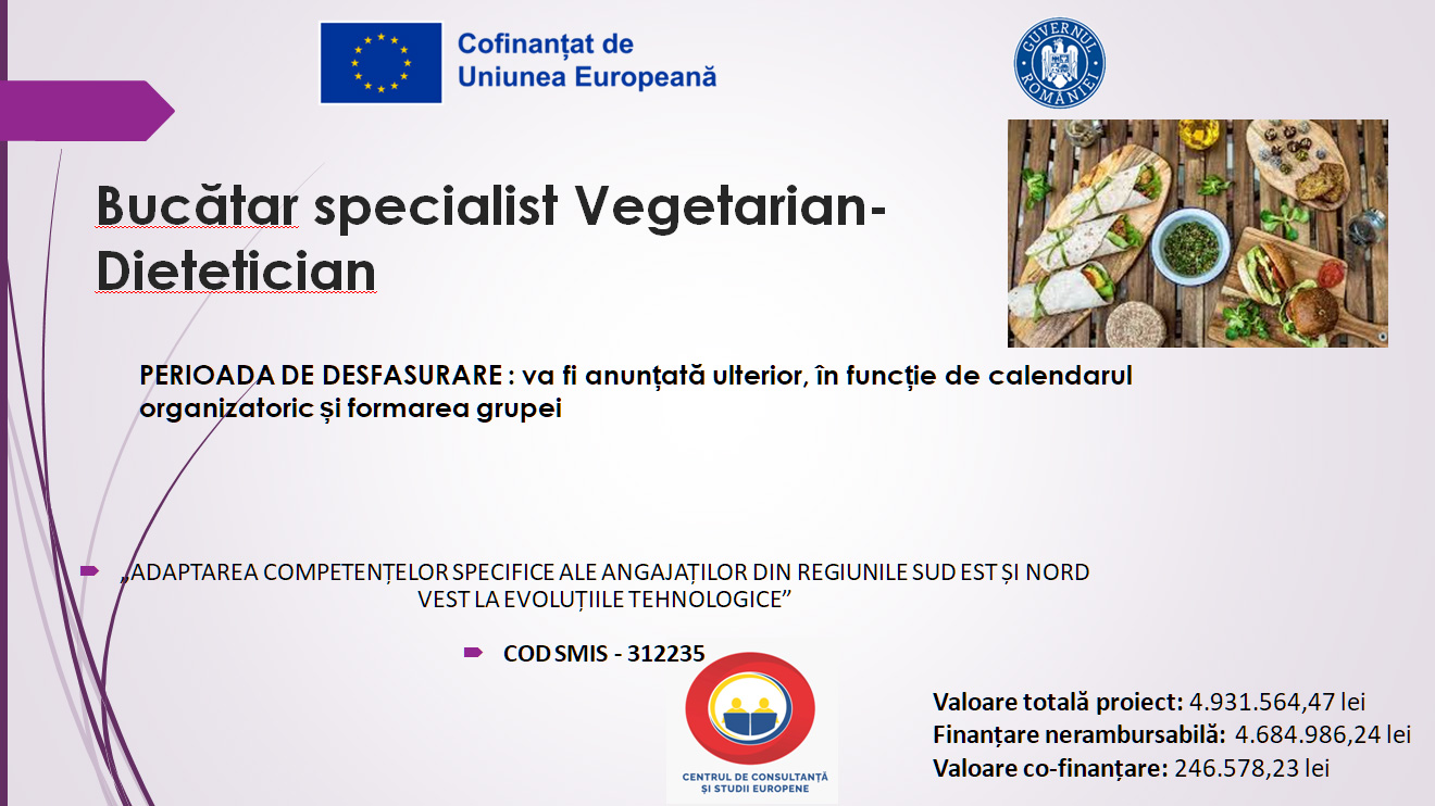 Descriere: Bucătar specialist Vegetarian-Dietetician pregătește preparate complexe, personalizate în funcție de nevoile speciale ale consumatorilor, fie din motive de sănătate, cum ar fi diverse afecțiuni și alergii, fie din considerente morale sau religioase, precum dietele vegetariene, vegane și raw vegane. Acesta poate activa în bucătării profesionale din restaurante, instituții medicale, sanatorii sau cantine destinate copiilor și sportivilor, sub coordonarea unui bucătar-șef sau a unui medic dietetician. Cursanții vor învăța să elaboreze meniuri dietetice, vegetariene, vegane și raw vegane, să propună meniuri personalizate și să adapteze preparatele din bucătăria națională și internațională.