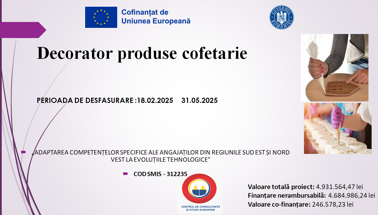 Descriere: În cadrul cursului „Decorator produse de cofetărie”, participanții vor învăța să creeze și să decoreze deserturi utilizând tehnici artistice și de specialitate. Abilitățile dobândite includ folosirea echipamentelor de decorare, cunoașterea materiilor prime și materialelor, pregătirea și depozitarea corectă a ingredientelor, aplicarea principiilor estetice și cromatice, modelarea și asamblarea decorațiunilor, precum și respectarea standardelor de calitate și siguranță alimentară. Această profesie permite exprimarea creativității, este foarte apreciată în industria alimentară și oferă diverse oportunități de carieră în cofetării, patiserii și organizarea de evenimente speciale.