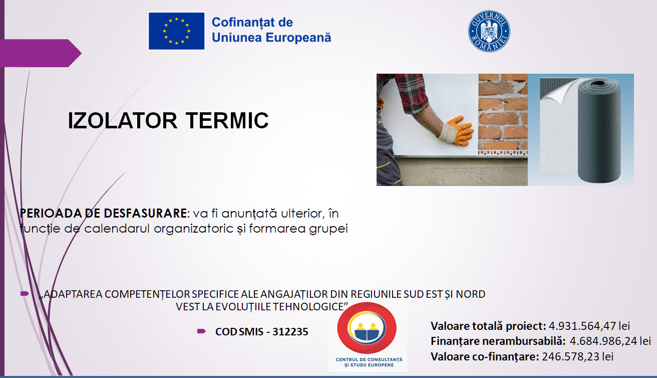 Descriere: Cursul de izolator termic pregătește specialiști capabili să realizeze diferite tipuri de izolații, inclusiv termice, fonice, hidrofuge și speciale, aplicabile pe clădiri și instalații industriale. Participanții învață să organizeze eficient locul de muncă, să utilizeze corect echipamentele și materialele specifice, să pregătească suprafețele pentru izolații și să execute lucrările de izolație și protecție. De asemenea, cursanții dobândesc competențe în respectarea normelor de securitate, protecția mediului și colaborarea eficientă în echipă, asigurând astfel calitatea și siguranța lucrărilor. Această calificare este crucială pentru reducerea pierderilor energetice și creșterea confortului și siguranței clădirilor.
